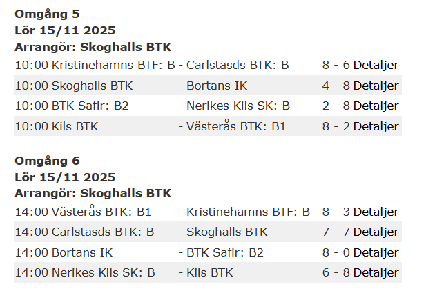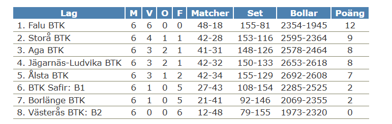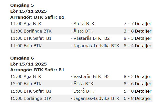 Storå BTK hade en blandad helg med oavgjort mot Aga BTK (7-7) i omgång 5 och som just beskriven en knaper seger mot BTK Safir B1 (8-5) i omgång 6. Storå befäster dock ändå tillsist andraplatsen i tabellen med 9 poäng och möter Jägarnäs-Ludvika i nästa match innan serien-vänder och har därmed allt i sina egna händer för att landa andraplatsen vid serievändningen.
