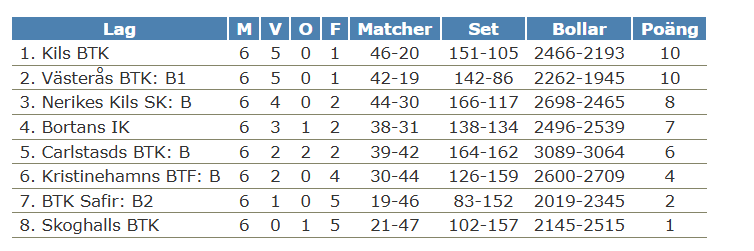 I division 3 NSSV blev det dramatik i toppen. Kils BTK tog över serieledningen efter två viktiga segrar. I omgång 5 besegrade man tabelltvåan Västerås BTK B1 med 8-2, och i omgång 6 vann man derbyt mot Nerikes Kil SK B med 8-6. Kils BTK leder nu serien med 10 poäng, samma poäng som Västerås BTK B1 men med bättre matchskillnad.