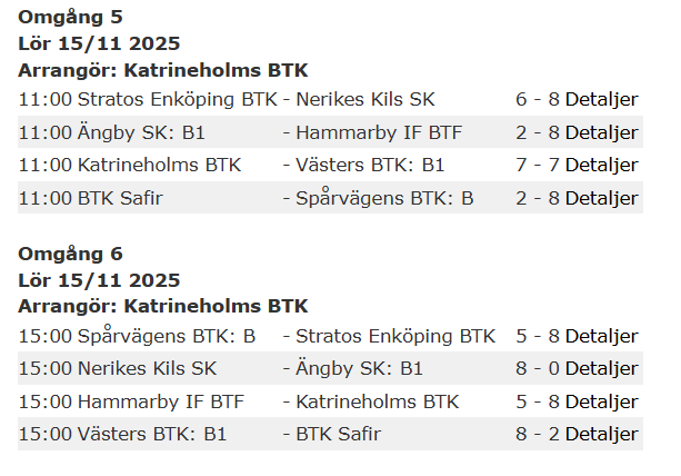 BTK Safir B1 fick äntligen smaka på seger efter fem raka förluster. I omgång 5 vann man med 8-3 mot Västerås BTK B2, men i omgång 6 blev det förlust med 5-8 mot Storå BTK. Det var dock ganska nära på 7-7 då Patric Borelius match mot Sonny Landing avgjordes i skiljeset 10-12 till Storå BTK's fördel, och fjärde matchen, som inte räknades i protokollet, vanns av Ludvig Johansson mot Mikael Rydstedt. Med en vinst och fem förluster ligger Safir B1 på sjätteplats med 2 poäng och avslutar halva serien med match mot bottenrivalen Borlänge i Kumla den 13 december.